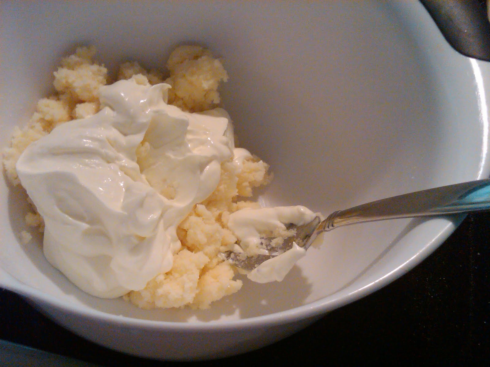 Combining sour cream with creamed butter and sugar. I also added the Cointreau and a tsp of salt to this mixture.